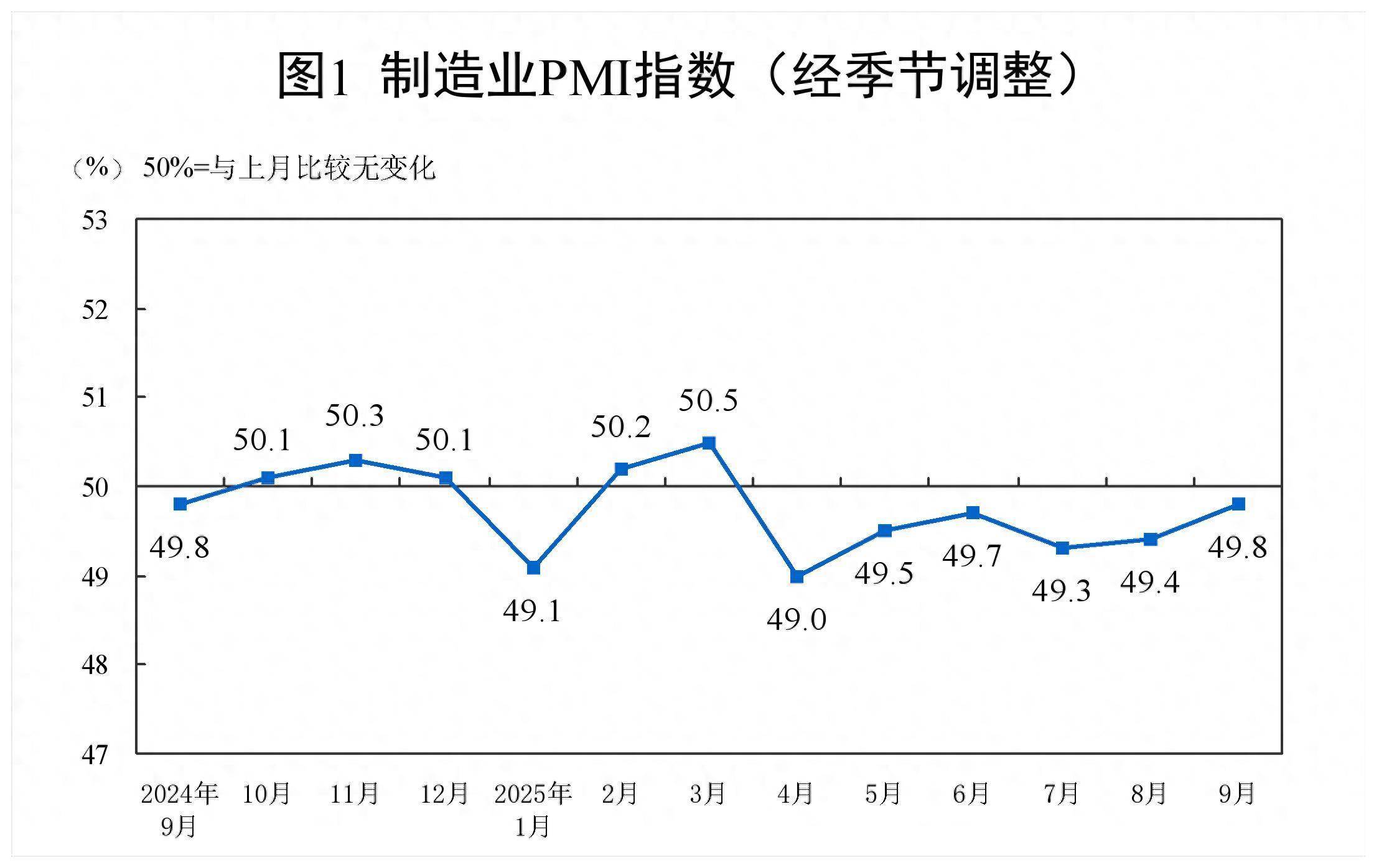 9月份,制造业采购经理指数(PMI)为49.8%,比上月上升0.4个百分点,制造业景气水平继续改善。